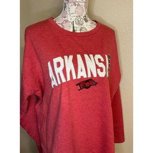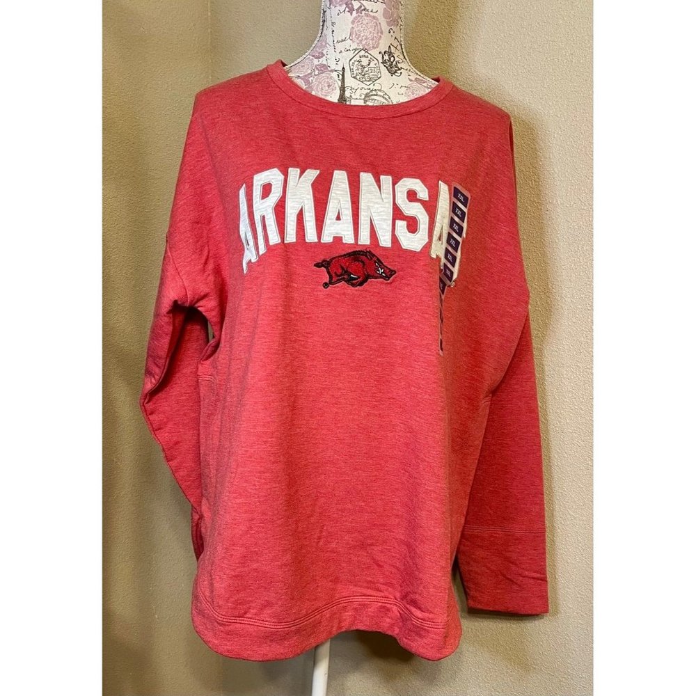 Super cozy and soft Arkansas Razorbacks pullover. Elevated appliqué embellishment. Crew style neckline and curved hemline.