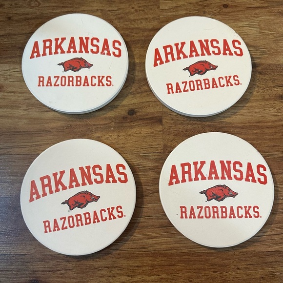 Four Arkansas Razorbacks coasters with cork bottom. Very nice heavy duty.