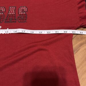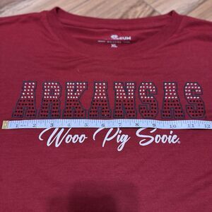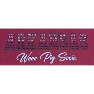 Show your Razorbacks pride with this red Colosseum women’s tee in size XL. Features “Wooo Pig Sooie” script with glitter accents and varsity stripe sleeves. Made from a soft poly-rayon blend — perfect for game day, tailgates, or lounging.