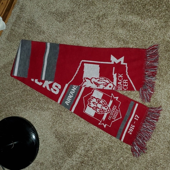 Red, gray, and white Arkansas Razorbacks soccer scarf. 100% acrylic.