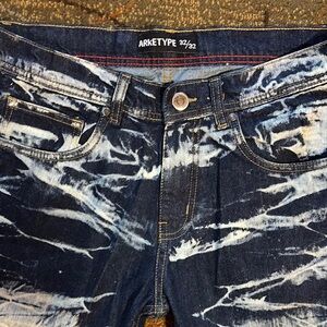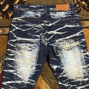 These blue straight jeans showcase a dramatic acid-wash design that features bold contrasts between light and dark shades. The extensive bleaching creates wide, irregular bands of light blue, giving them a vintage and distressed appearance. Retaining some of the original dark blue color at the waist and bottom, these jeans are a stylish addition to any casual outfit.