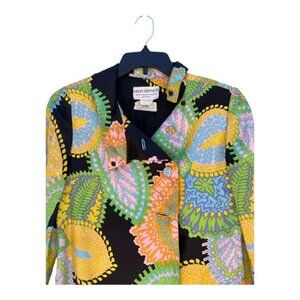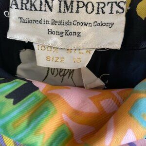 VINTAGE**Arkin Imports 100% silk topper jacket for Joesph Magnin. Beautiful 3 button & 5 snaps, 100% silk, lined coat with 2 side pockets. Women's size 10 19" underarm to underarm, 39" length. I believe the Joesph on the tag is Joesph Magnin (also a department store), son of I. Magnin. Arkin Imports Tailored in British Crown Colony Hong Kong. *Flaw-there is a light mark (barely noticeable) between 2 of the buttons. Please review pic. Preowned good vintage condition.