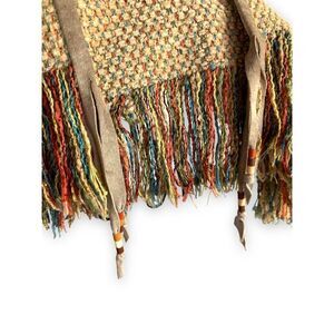Super soft weaved cropped vest with Native American design on the back. The brand is Arlanda design Inc. From Boulder CO. Very soft fringe, vegan leather trim that turns to fringe in the front with plastic beaded detail. Colors are tan, metallic gold, turquoise, burnt orange.