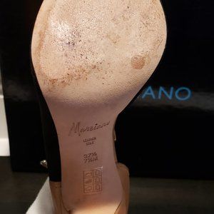 • Leather upper. Stiletto heel. Gold-tone metal plate at ankle.