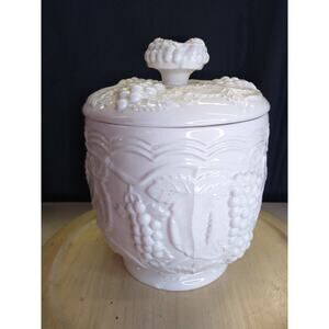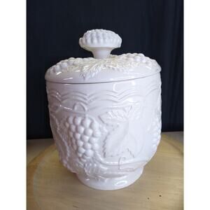 Vtg Arnel's milk white canister/jar. Grapevine Pattern. Medium. Has a few Knicks, but beautiful.