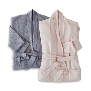 “Plush, long robe envelopes you in warmth and comfort thanks to its sumptuous cashmere and wool blend.” Shawl collar, patch pockets at front sides, self-tie belt