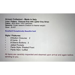 Size and Measurement Disclaimer: Do not rely on the size tag, suits may be altered or customized. Please compare the measurements provided to an item you own before ordering. Thank you for your help!