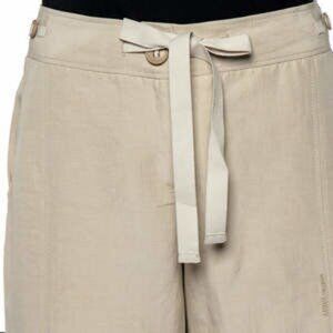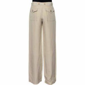 Revamp your collection by adding these trousers from Armani Collezioni. They are tailored using beige linen and silk, with four pocket details, a waist-tie, and button accents. Match these wide-leg trousers with your favorite chic blouse and heels as you head out.