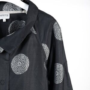 This jacket from Armani Collezioni is crafted in a black shantung with a silver mandala jacquard pattern throughout, and features long sleeves, a collared neckline, hidden front snap closures, a swing bodice, and a pleated back peplum hem.