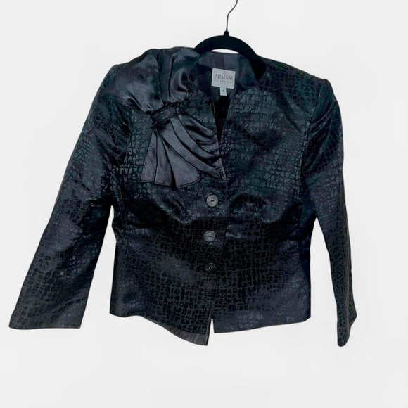 Armani Collezioni blazer jacket, Armani evening jacket, Armani women’s size 6, designer black blazer, satin detail blazer, Armani Collezioni textured jacket, Armani cocktail jacket, luxury blazer women, tailored evening jacket, Italian designer blazer