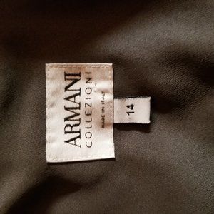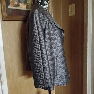 This Armani Collezioni jacket, size 14, is nearly new, with no signs of wear, in a gunmetal gray shade. I think it leans more blue/gray, as seen in images one and three. The fabric has a slight sheen to it.