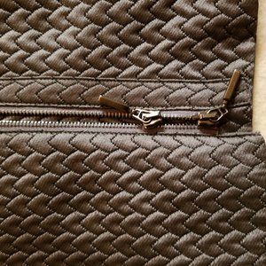 Styled like an elegant, elevated motorcycle jacket, it has a two-way zipper and slash front pockets. The fabric label has been removed but has a soft, drapey hand, like a rayon or rayon/silk blend. It is on the lighter side, and the quilting is low profile - more decorative, not puffy!