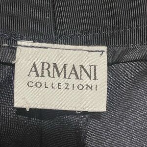 These Armani Collezioni dress pants in navy offer a sleek, tailored fit with a flat front and pressed creases for a polished look. Crafted from a smooth fabric, they are ideal for formal occasions, providing a modern silhouette with a straight leg.