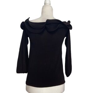 Beautiful silhouette Armani Top featuring in or off the shoulder top with double layer structured ruffle detailing. 3/4 Sleeves. Lightweight stretch fabric for an ultra flattering fit