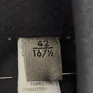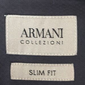 Armani Collezioni Slim Fit Button Up Long Sleeve Shirt in Black - Size 16 1/2. Great pre-owned condition. Color is a soft black with tiny diamond design, black on black. Long sleeves, button cuffs, 2 button option. Full button front, extra buttons provided. Shirttail hem, collared. A little shiny on the edges of the collar. This is from being pressed at the dry cleaner. 100% cotton. Approximate measurements: 21" pit to pit, 32" length.