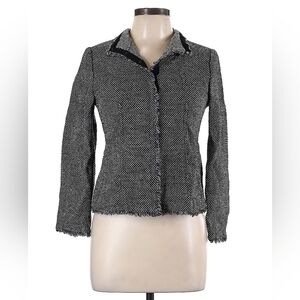 Step into timeless elegance with this Armani Collezioni women's blazer. Crafted in Italy from luxurious 100% virgin wool, this black and white woven jacket exudes sophistication with its structured silhouette and classic notched collar. Subtle frayed edging adds a modern twist, while the tailored design offers a flattering, feminine shape.