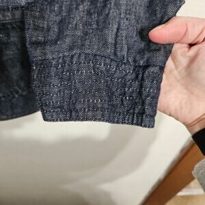 Armani Collezioni Women’s Dark Blue Denim Button Up Blazer. Size 8. Front pockets. Faux leather trim. More blue in person.