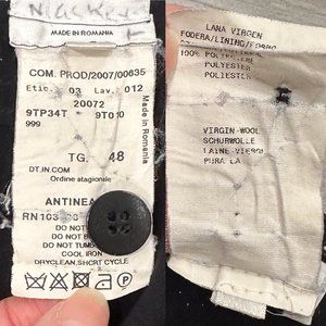 MATERIAL: Virgin Wool Lining- 100% Polyester. Made in Romania. Dry Clean Only.