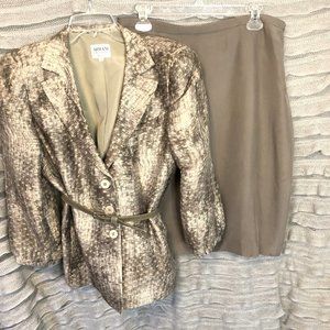 3/4 sleeve beautiful suit from the 2002 collection. This is a used item, I see no signs of wear. Jacket is a 12 Skirt is a 14 (has had slight alterations). Skirt is about 20.5" at hip (flat - 41" around) and about 20" long. Vintage Armani. The jacket has a self-belt (see pics) Belt feels to be suede.