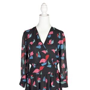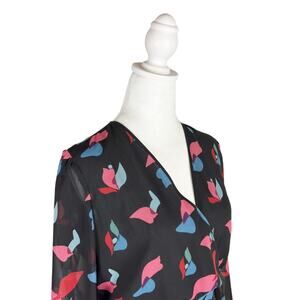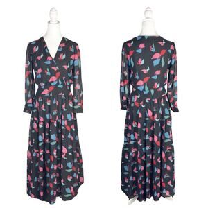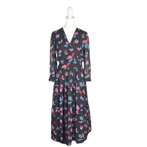 This Emporio Armani Tiered Maxi Dress captures refined sophistication with its fluid silhouette and modern graphic print. Crafted from lightweight printed georgette, the dress features a wrap-effect bodice, buttoned cuffs, and a flowing tiered skirt that moves beautifully with every step. A concealed side fastening maintains the brand’s signature sleek finish, while the colorful pink and blue abstract print adds a chic, feminine edge to the black base.