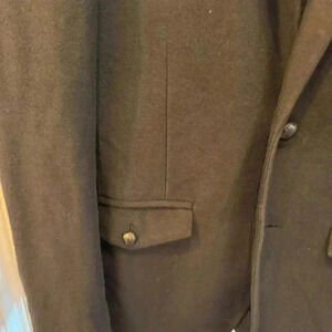 The jacket is single breasted with a two button close. It has a single vent back. Front pockets. See photos for measurements
