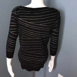 3/4 sleeve light weight black boat neck sweater. Shoulders have studded detail. One side needs to be reinforced (please see photo) metallic silver stripes. Size medium