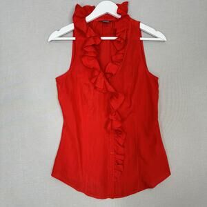 Elegant and timeless, this sleeveless red silk blouse by Armani Exchange features a feminine ruffled V-neckline and button-down front. Crafted from 100% silk for a luxurious, lightweight feel—perfect for work, date night, or special occasions. Flattering tailored fit, vibrant color, and high-quality design make it a versatile statement piece. luxury designer blouse, elegant workwear top