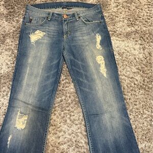 Stylish flare jeans by Armani Exchange. Distressed detailing. Classic blue color. Perfect for casual wear.