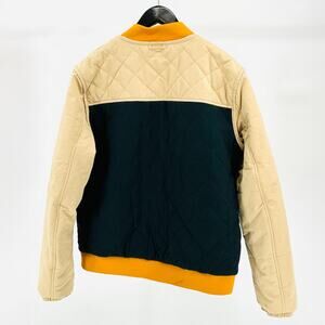 Excellent condition. Colorblock design with ribbed knit collar, hem, and cuffs. Snap front closure. Quilted lining. Upper body 65% cotton, 26% polyester, 9% nylon. Lower body 50% polyester, 40% wool, 10% other fibers.