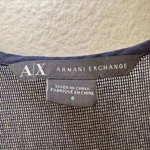 This is a blue Armani Exchange dress for women in size 8. It features a sleeveless design with a sweetheart neckline, zip closure, and knee-length fit & flare style. The dress is made of a blend of spandex, and cotton, and is machine washable. It is suitable for various occasions such as travel, weddings, parties, casual or formal events, workwear, or business settings.