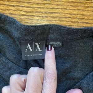 This is an Armani Exchange ladies shirt. The front has buttons hidden by a bedazzled cover. Buttons can be left open for a more relaxed look. The shirt is super soft and is an acrylic, wool and nylon blend. The sides of the shirt are split so it can be worn untucked and still have a finished, put together look!