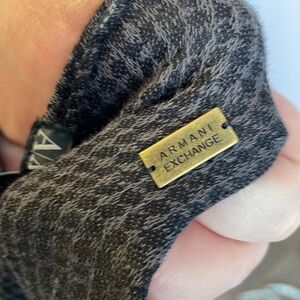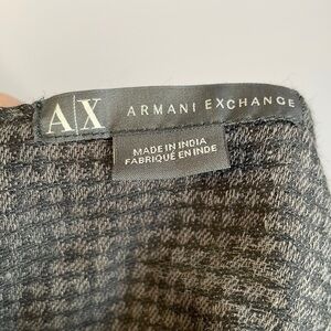 Armani Exchange Gray Black Fringe end Scarf Tweed Textured Printed. Not quite a tweed but similar I think. Pattern hard to give it another name. Very good preowned condition. See pictures for measurements. No fabric tag. Soft material.