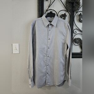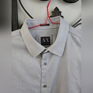 Stylish gray button-up shirt. Perfect for a casual or semi-formal look. Armani Exchange Gray Herringbone Button Up Shirt. Size M Slim Fit. In great used condition with a minor stain on the back as seen in pictures.