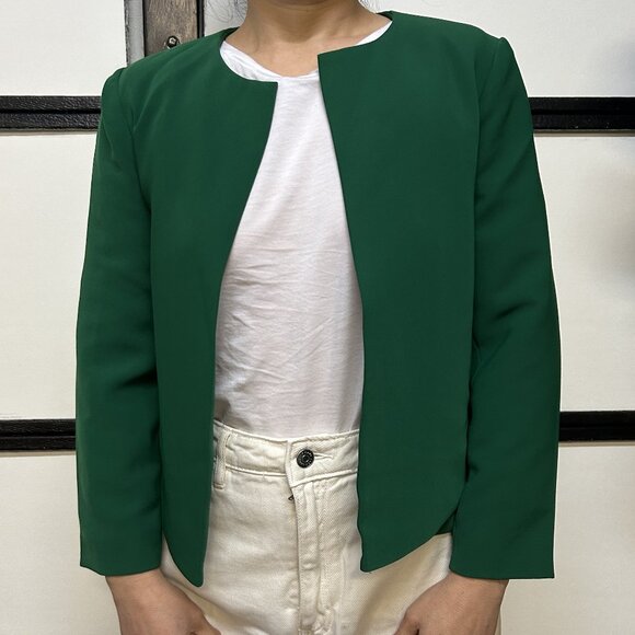 An Armani Exchange green short jacket, size XS. Open front with flattering shape. Polyester material, fully lined. Like new, never worn.