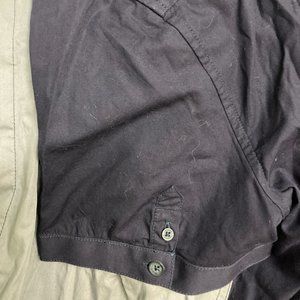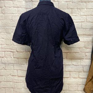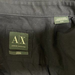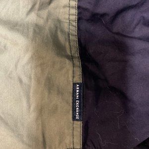 A men's Armani Exchange color block short sleeve shirt. Front is blue/gray/green, back is blue. 100% cotton. Buttons are hidden behind the front seam. Size is medium regular, measures 19 inches armpit-to-armpit. small A/X label on left edge, buttons on end of each sleeve. Made in India.