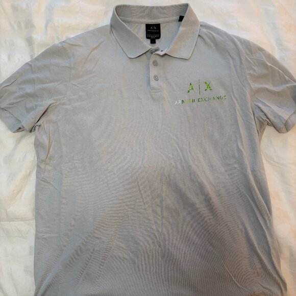 Light gray with green logo on chest. Size Large. Discoloration of "AR" in Armani. No other signs of wear.