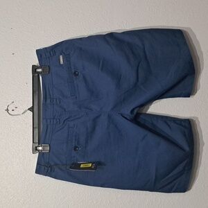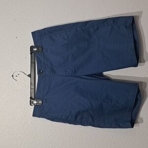 Stretch cotton bermuda short with front button and zipper closure, front and back pockets and belt loops. Small logo plate on back right side above pocket.
