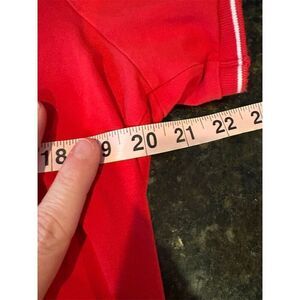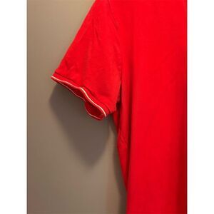 This Armani Exchange men's T-shirt in size Standard Large (L) features a slim fit and is crafted from cotton. It comes in a solid red color with a V-neckline and short sleeves. The shirt includes distinctive A|X logo on the back shoulder and striped detailing on the collar and sleeves. Made in China, this T-shirt is suitable for casual outings or relaxed social gatherings. It is pre-owned with several very small stains on the front. Keywords: Armani Exchange, men's T-shirt, red, slim fit, V-neck, short sleeve, casual wear, cotton, A|X logo, striped detailing, pre-owned, size Standard Large (L), solid pattern, China, men's fashion Brand: Armani Exchange Size: Standard Large (L) Color: Red Department: Men Type: T-Shirt Fit: Slim Sleeve length: Short Sleeve Pattern: Solid Country/region of manufacture: China Neckline: V-Neck Features: A|X logo on the back shoulder, Striped detailing on the collar and sleeves Material: Cotton Clean and smoke free home Top rated seller Fast shipper Bundle and save