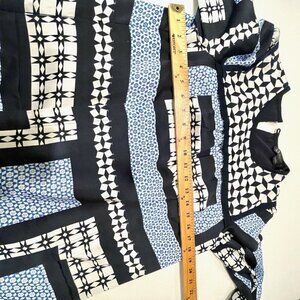 The dress is made from polyester, making it light and comfortable to wear. The dress is a size 2 and features a classic blue geometric pattern, making it perfect for any season.