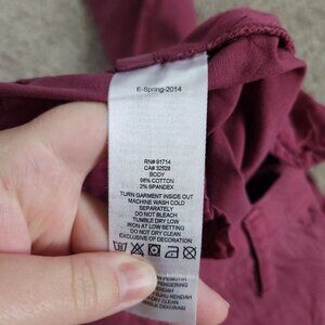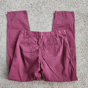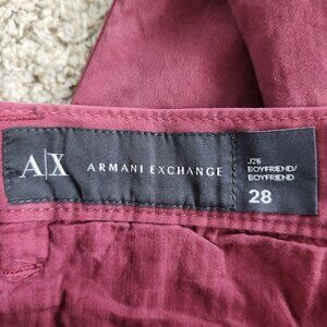 These pants are by Armani Exchange. They are in the boyfriend style in a red/purple color. They have front pockets and a single button and zipper fly closure. They do feel more khaki-like than denim. They are in excellent pre-owned condition with no holes, rips or stains. Bundle with other items in my closet to get the most out of shipping!