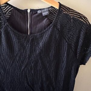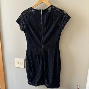 Super flattering short sleeve Armani Exchange dress. Features silver zipper detailing down back, and mesh/lace overlay