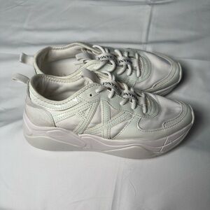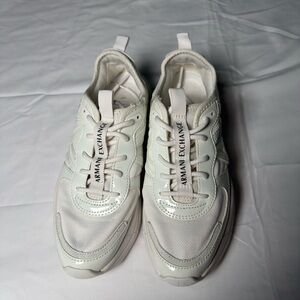 These Armani Exchange sneakers feature a sleek white design with a chunky sole, offering a modern and versatile look. Crafted with a combination of mesh and synthetic leather, they provide both style and comfort. Perfect for casual outings, these sneakers embody the popular 'dad shoe' aesthetic.