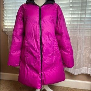 Armani Exchange Women’s Black/Orange/Pink Reversible Winter Puffer Long Coat, XL