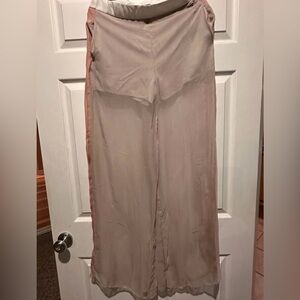 Wide leg, loose fitting pant with sheer viscose fabric over shorts on inside layer. Small metal logo plate on back right side.