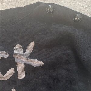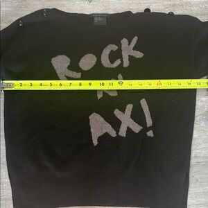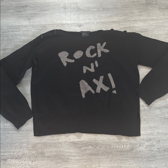 Vintage-inspired cropped sweater from Armani Exchange in black with metallic silver “ROCK N’ AX!” graphic across the front. Features a classic crewneck, two decorative black beads on the right shoulder, and two buttons on the left shoulder. Long sleeves with side slits at the hem for a relaxed fit. Fabric tag has been removed, but the sweater is in good condition with no stains or holes.