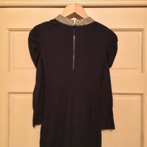 Elegant black mini dress with intricate embellishments. Features three-quarter sleeves. Perfect for evening events.
