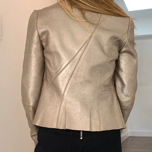 Super fitted soft gold leather jacket with with high buttoned collar, YKK bronze front zipper and 2 hidden side pockets