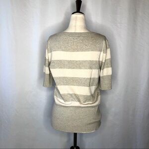 Armani Exchange short sleeve cream and grey striped sweater with AX NYC in sequins on front. Good pre-owned condition: very slight pilling and a single missing sequin, as shown in photos.