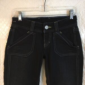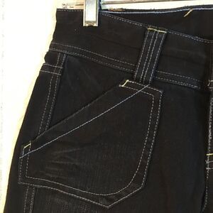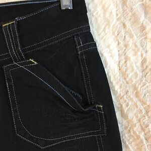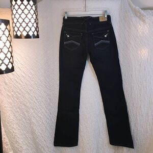 Dark wash boot cut leg jeans. Front and back pockets. Zipper and button closure detail. Pre-owned in great condition. Please refer to pictures for best description and condition verification.