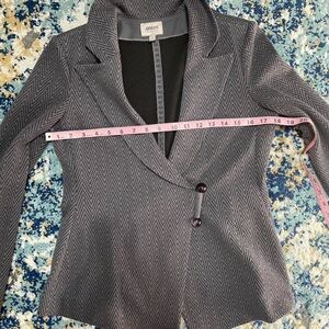 Vintage Armani designer blazer made in Italy. Unique snap button closure. Stretchy but structured - think like a sweatshirt blazer. Gray and black.